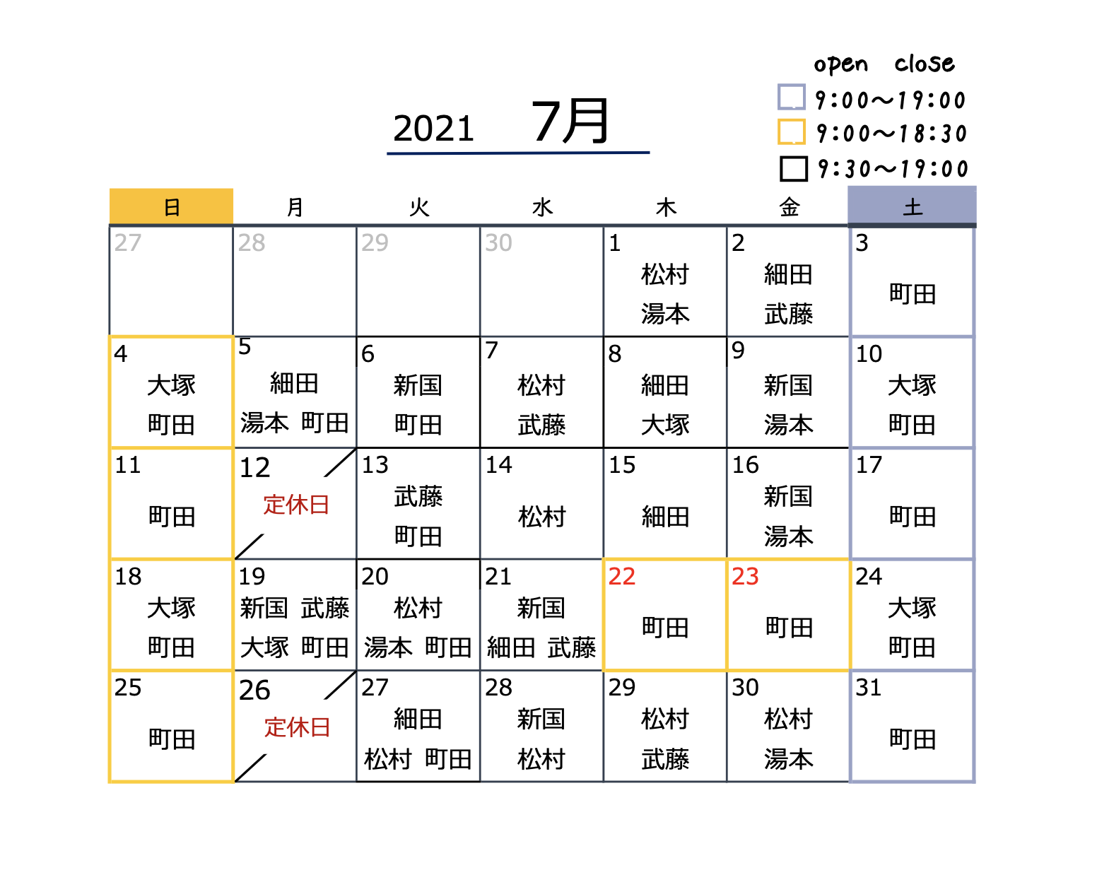 7月のスタイリストの休みと定休日は以下の通りです