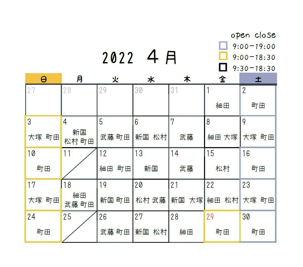 4月の定休日は11日(月)、25日(月)となります。